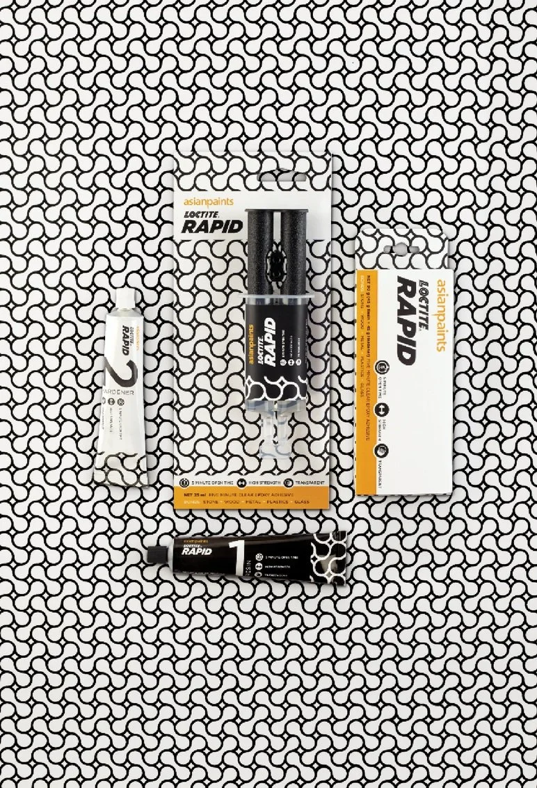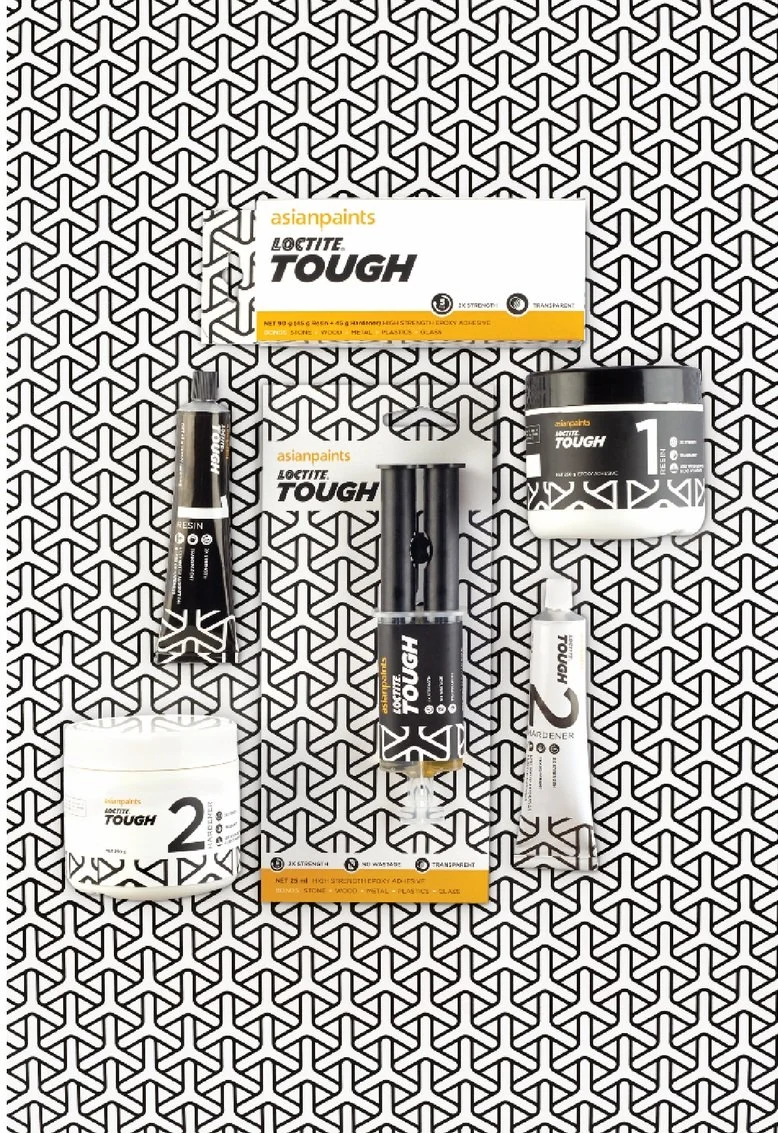 The packaging design employs striking patterns that suggest the raw bonding strength of each adhesive, collectively creating a visually elegant system – one that can grow as the range expands. A dominant use of black and white resonates with the category of adhesives at a very fundamental level – and is clutter breaking in the Indian industrial adhesive markets, creating a strong visual identity to aid recognition at the point of sale.